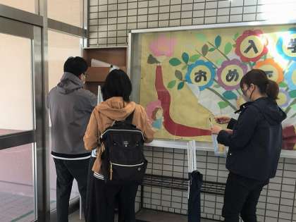 4月10日の交通立ち当番にご参加いただいた保護者の皆さま、ありがとうございました。〔写真:当番を終えて、黄色い旗を返納する担当の方々〕
