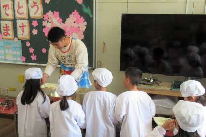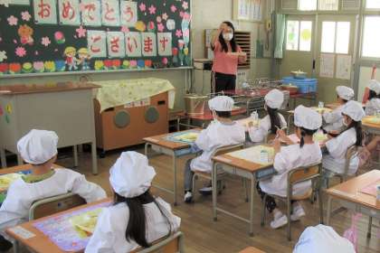 多くの1年生が、はじめての給食をおいしくいただきました。後片づけの方法も教わります。
