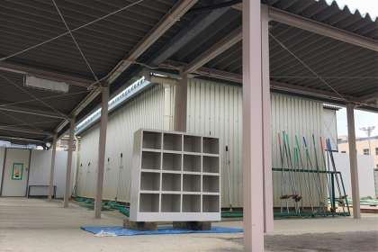 管理作業員さんは、天候不良で屋外業務ができない時に、屋内で日頃手が回らない作業等をしてくれます。本日は、雨にあたらない渡り廊下で、靴箱の塗装を行いました。