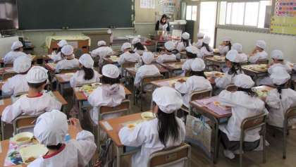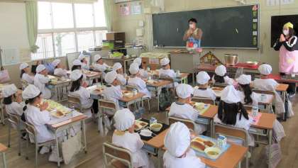 カレーライス等、食べやすい献立が続いていることもありますが、新年度になって、子どもたちは給食をおいしく食べているようです。残食が減っています。〔写真:1年生〕