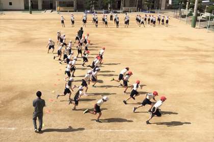 おにごっこの変形版、カラーコーンを境に赤白に分かれて並び、先生のかけ声で一方が逃げ、他方が追いかけます。