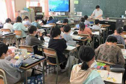 資料をノートに貼って、日本の国土の位置や広がり、周りの国々について調べます。