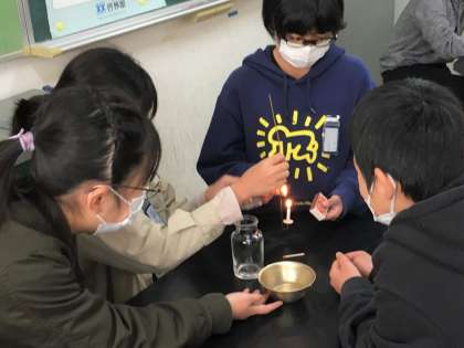 物が燃える時の空気の変化を調べました。予想を立てて、実験します。