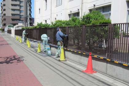 プール横から、東南側の通用門までの歩道に面した駒止柵を塗り直しています。作業は、5月12日(金)までの予定です。塗料が衣服等についてしまうと、とれないので、近づかないようにと伝えています。
