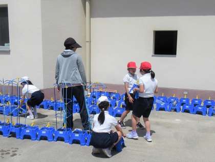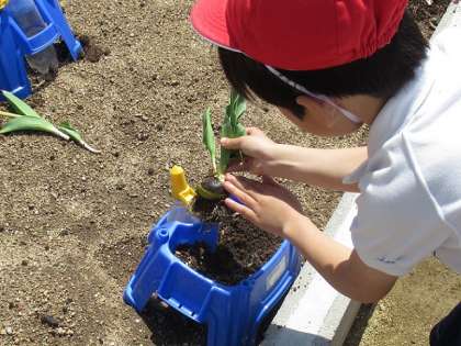 2年生は、1年の秋に植えたチューリップの花が終わったので、球根を掘り出し、プランターの土を入れ替え、野菜の苗を植える準備をしています。ナス、オクラ、ピーマン、ミニトマトから選んだ野菜を育てます。