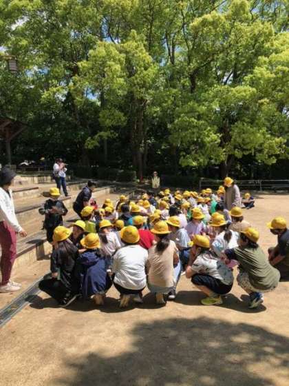 5年が遠足で須磨離宮公園に来ています。班ごとに集合して、今からアスレティックに行きます。
