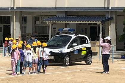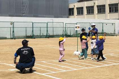1・2年生は、校庭にラインを引き、信号機、駐車車両も用意し、実際の道路に見立てて、安全な歩き方を体験しました。