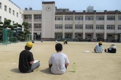 親しみのある校舎と美しい花を遠近法で重ねて描きます。花の絵を仕上がったので、校舎の写生に取りかかります。