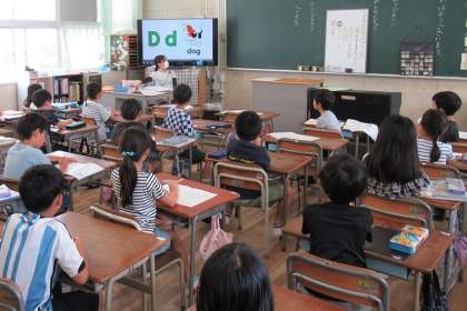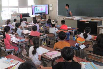 朝の会の時間に、音楽や映像を通して英語に親しみます。子どもたちは興味を持って取り組んでいます。〔写真:2年生〕