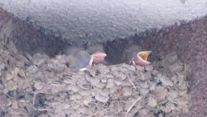 ツバメのヒナがかえりました。巣から顔をのぞかせています。子どもたちが登校する時間帯に、親がヒナに餌を与える様子が見られます。