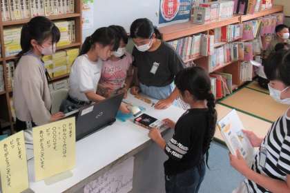 〔写真:1学期に昼休みの図書室開放も再開しました。火・木曜日は、図書委員が本の貸出を行ってくれました。〕