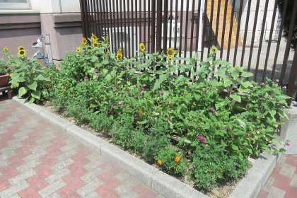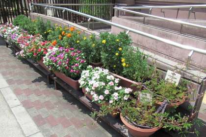 本校玄関の花壇、プランターには、色鮮やかな花が咲いています。