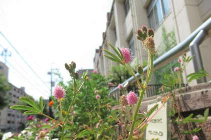 オジギソウもピンクの花をつけています。オジギソウの茎には「トゲ」があります。葉っぱにふれる際には、気をつけてください。