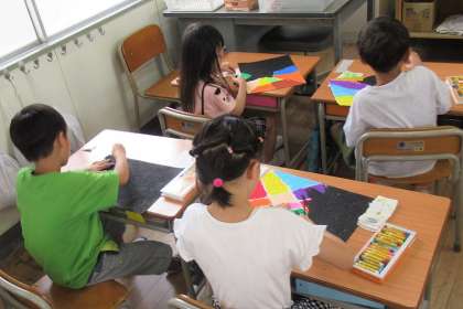 カラフルに色分けした画用紙を、真っ黒に塗りつぶしました。どのような作品に仕上がるのか?お楽しみです。