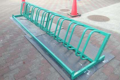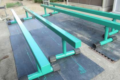 カラフルな遊具が設置されたので、管理作業員さんが一輪車スタンド、平均台を鮮やかな緑に塗り直しました。
