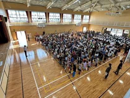 ピカピカの床、まぶしい照明、新築の香りがする講堂に、全校児童が集まりました。