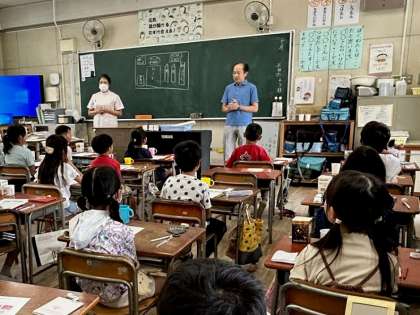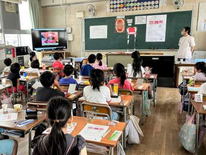 学校歯科医先生のお話の後、実際に歯をしっかり磨く練習をしました。