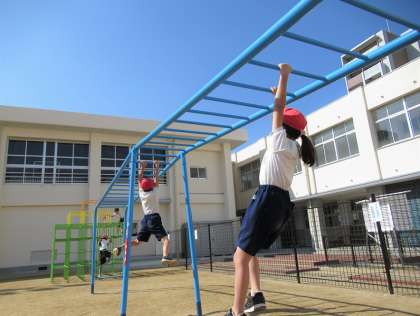 登り棒、うんてい、ジャングルジムの新しい遊具を使って、握力、腕力を鍛えます。