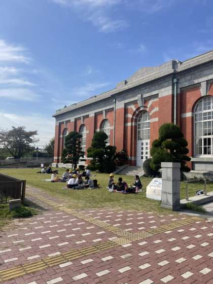 浄水場を見学した後、広場の芝生でお弁当を食べました。
