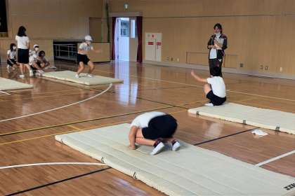マットや跳び箱を使った授業が始まります。〔写真:6年生〕