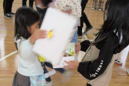 2年生は、自分たちでつくったおもちゃを使って「お店」を開き、1年生を招待しました。呼び込みをする者、遊び方やルールの説明をする者、1年生をサポートする者、様々な役割を果たしていました。
