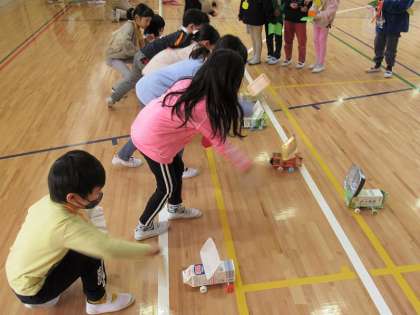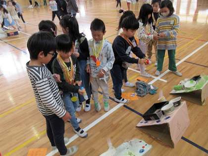 講堂一面に、いろいろな「お店」が並び、遊び(活動)に熱中する1年生の姿が見られました。