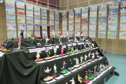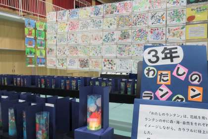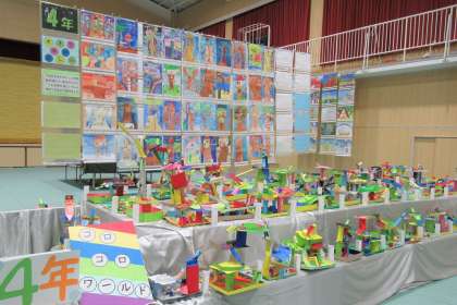 新しくなった講堂に、子どもたちの個性豊かな力作が並んでいます。