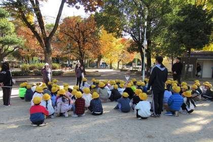 雲ひとつない青空の下、1年生は十三公園に出かけ、秋を感じさせるものを探しました。