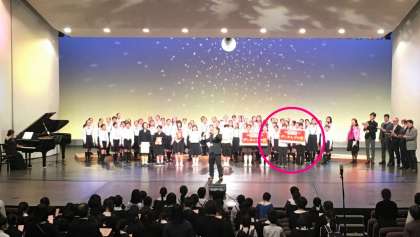 受賞理由は、「コロナ禍を乗り越え、合唱を再開できた喜びを最も表現していた」ということでした。〔写真:表彰式の様子、塚本小学校の代表メンバーを円で囲っています。〕