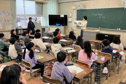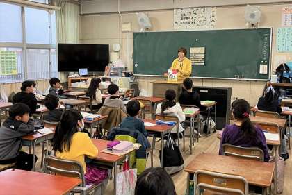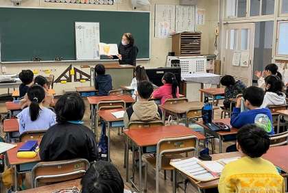 子どもたちの発達段階や実施時期に応じた内容の絵本を選んでお話をしてもらっています。〔写真:2年〕