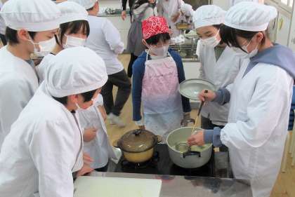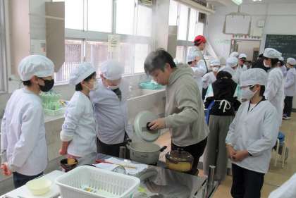 教頭先生から、「みそしる」は、だしをとったにぼしは砂糖と醤油で炒めておかずに、じゃがいもの皮は肥料になるので、廃棄するところがない料理であると教わりました。