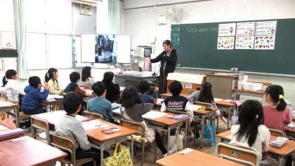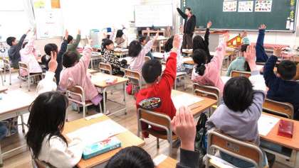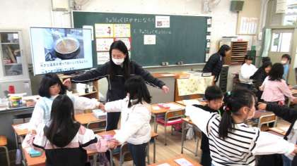 「きゅうしょくはかせになろう」、近隣校の栄養教諭の先生をゲストティーチャーに、クイズを交えたり、お友だちを手をつないで大鍋の大きさを体感しながら、毎日食べている学校給食について理解を深めました。