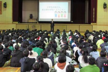 新北野中学校にて、塚本小学校と神津小学校、田川小学校の6年生が、中学生の先輩から中学校生活について説明を受けました。新北野中学校での生活ヘの不安が和らいだ、他校に進学する児童も含め、中学生になる心がまえや自覚が高まったと思います。