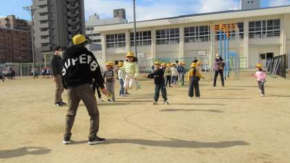 6年生の運動委員会のメンバーが、1年生の大なわを回すお手伝いをしてくれています。