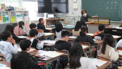 大阪珠算協会の方を招いて、そろばんを使った計算方法を学びました。