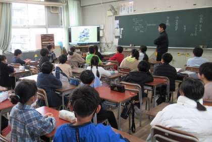 朝学活の時間に、英語の歌や物語を通して、楽しみながら英語に親しむ機会を設けています。(写真:4年生)