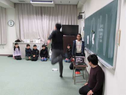 集会委員のメンバーが、運動場でのゲームを企画・準備していましたが、雨天でオンライン開催となったので、急遽、教員がゲームを行いました。