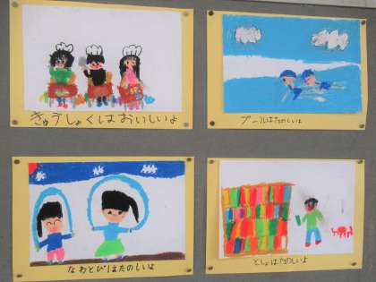 プール、遠足、キッズプラザへの社会見学、おちばひろい、むかしあそび、おおなわ等の行事・活動から日々の学校生活まで、いろいろな絵があります。