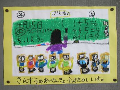 新入生の教室には、絵が貼ってあります。新2年生が1年生で体験した楽しい思い出を、絵にして新入生に教えてくれています。