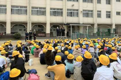 10年〜1年と期間は違いますが、皆が「塚本小学校の子どもたちは、素直で、打てば響く子が多いので、期待に応えてくれた。また、保護者・地域の方々も教育活動に協力的なので、貴重な経験をたくさん積むことができた。感謝の気持ちでいっぱいです」と、述べていました。(写真は、着任式の様子)