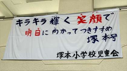 塚本小学校の玄関ホールに入り、顔をあげると、今年度の児童会目標の横断幕が目に入ります。