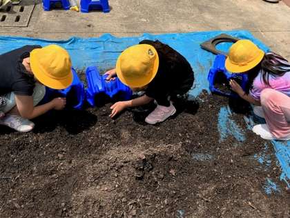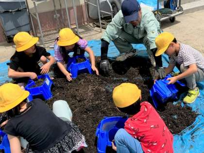 2年生は、野菜の苗を植えます。その準備として、プランターに土を入れました。