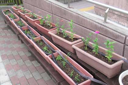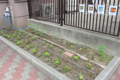 玄関のプランタや花壇に夏の草花を、管理作業員さんが植えました。