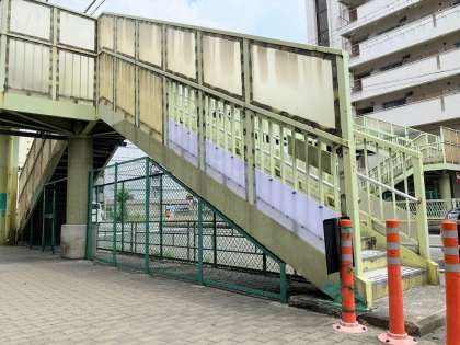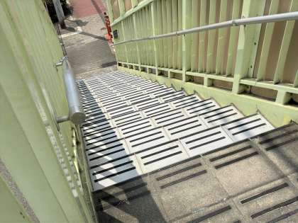 今回の工事では、2ヵ所ある階段の一つの床(踏み板)の部分が新しくなりました。また、側面の裾隠し板が低くなったので、歩道橋を通る人の様子が外から確認しやすくなりました。