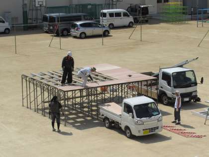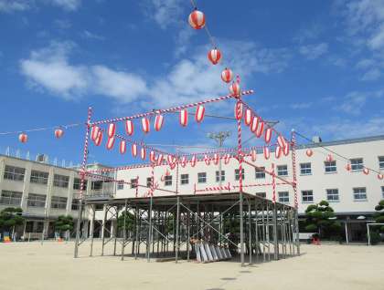 8月17日と18日に、本校 校庭で「納涼盆踊り大会」が行われます。やぐらが設置されました。