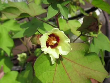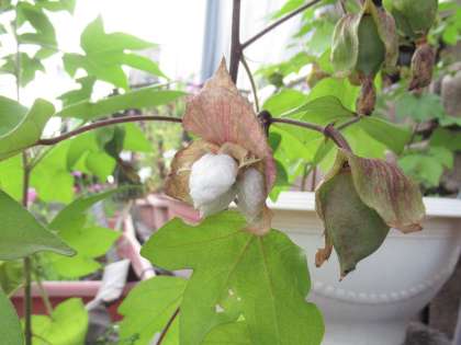 塚本小学校玄関の綿も、7月末に黄色の花を咲かせましたが、現在、実が開いて白い毛を見せています。
