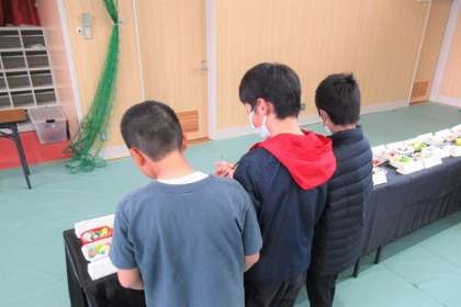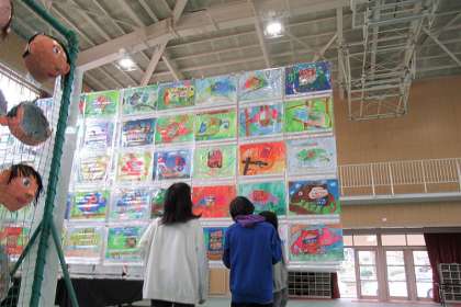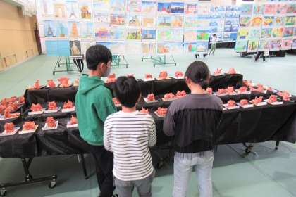 自分たちの学年の作品だけでなく、他学年の作品も興味を持って見学していました。お気に入りの作品を選び、その理由も含めて、ワークシートに書き込みます。