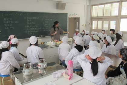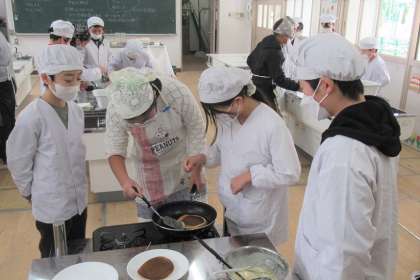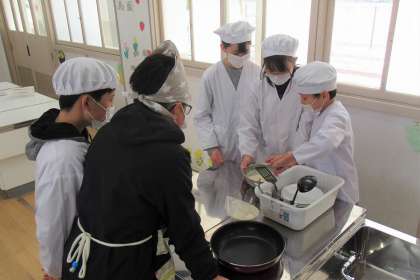 「おいしいパンケーキをつくろう!」、生地にポツポツがでたら、うらがえす。生地につまようじをさし、なにもつかなかったらできあがり。