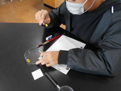 4月11日 アブラナの観察をしました。花のつくりを確かめるために、はなびらやおしべ、めしべをピンセットでばらしました。