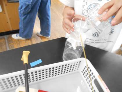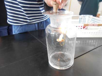 5月7日 理科で「ものの燃え方」について学習しています。今日は、ものが燃えた後の空気の成分は変化があるか?ということを確かめるために実験をしました。気体検知管と石灰水の使い方を学びました。